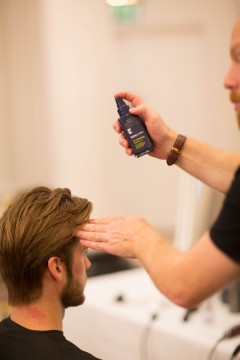 Using a small amount of label.m Thickening Tonic, spritz only a couple of times over the hair to give a natural look with some added grip