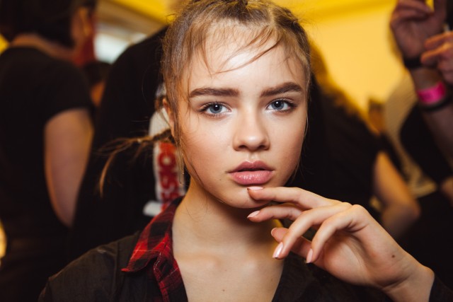 Leave baby hairs around hairline loose and free. Finish ends with invisible elastic and use light spray of label.m Hairspray to complete.