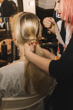 Separate the hair from crown to ear and secure the back into a low ponytail, smooth using label.m Hairspray.