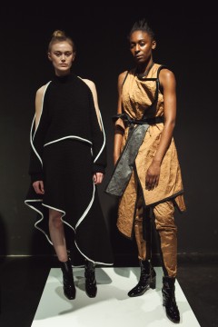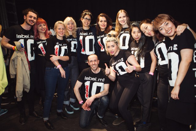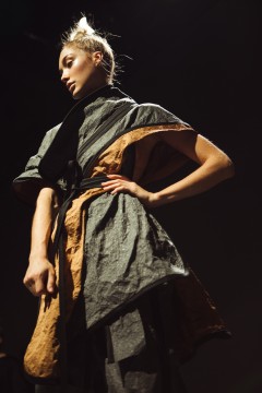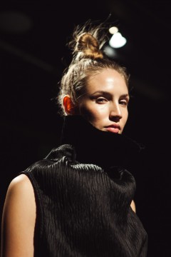 Hold ponytail high above head and twist so that it folds back on itself. Fold into a twisted donut and secure around the elastic with label.m Grips. Allow a few hairs to come free.