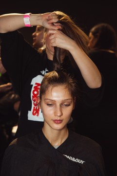 Use a label.m Grooming Brush to keep hair together and then with your fingers, texturise the hair so it does not sit too straight. Secure with an elastic tie.