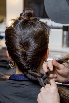 Brush hair through with a label.m Grooming Brush to smooth hair. Secure hair by cross-crossing grips around head before rolling into a smooth pleat. Create a loose braid at bottom of the pleat, finishing at front.