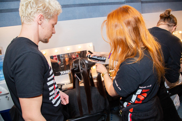 Create a radial parting from top of head to the top of the ears and apply label.m Fashion Edition Wax Spray and split into two sections.