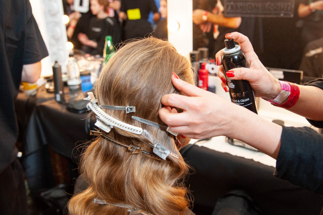 Use label.m Hairspray and take wider sections for the creation of deep waves. Taking a small tong on each section – wrap the hair tightly around the barrel for up to eight – 10 seconds. Release – then hold in place with section clips.