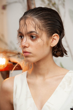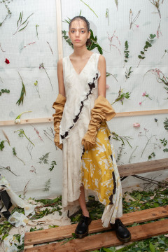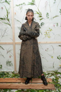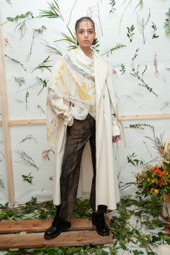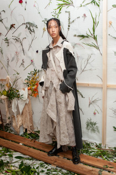 Wen Pan AW20 brings an image of quietness in chaos and celebrates the romance found in traces of human activities. What we found most beautiful in a crowded flower market was the road when the market finished. When stalls and people left, there were always flowers, petals, cut stems smashed on the road, into the water, which formed a raw romance in a random way. Smashed flowers are shown as the designer’s own prints on sheer cotton, contrasting with textured and coated cotton, which refers to wet rough roads