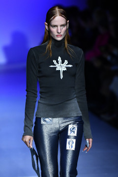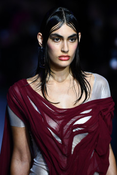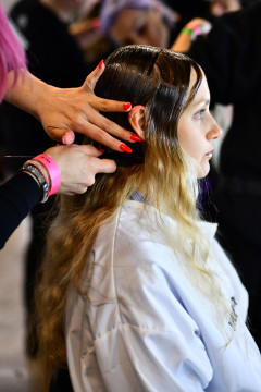 Following Di Petsa’s exploration into godess muses, the hair created by International Artistic Director, Efi Davies and the TONI&GUY Session Team oozed femininity. The hair had an ethereal nature, the roots were flat to the head using LABEL.M Fashion Edition Gel to givea wet look feel, while the ends were loose adding an undone texture to the final style.