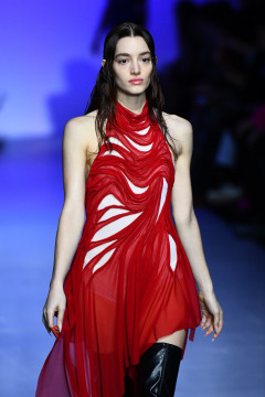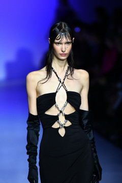 For AW24 the runway show will be transformed into a ceremonial procession of goddess muses, embodying female archetypes explored in ancient Greek mythology, and early Christianity - the Virgin Mary, The Madonna, The Angel, The Temptress. The performance begins with Live music performed by Flora Yin Wong, playing the Guzheng, and Dimitra Petsa, the designer reciting poetry. The space is cleansed with chimes of bells and incense and the Runway begins - starting with a floor length White Wetlook Goddess Venus Dress, adorned with Clear Quartz crystals and billowing off-shoulder sleeves elevating last season's Pink Venus Silhouette.