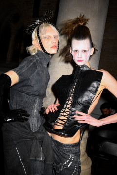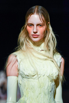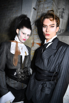 Lead by Eugiene Souleiman, the TONI&GUY Session Team continued the designers journey of strength versus vulnerability. This was seen in the hair through a contrast of textures. Ponytails were given force through the front using LABEL.M Fashion Edition Gel, yet an unkept texture through the back using LABEL.M Fashion Edition Texturising Volume Spray. The same was said for the models that sported looks with their hair down. There was strength through the roots, yet the ends showed the sensitive nature of what being feminine means today through a softness towards the ends.