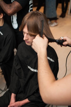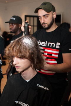 Following on from Daniel’s vision, Daniele and team created a style that harkened back to the 70s where hair wasn’t too polished or stylised. Using the model’s natural hair texture, the team created an easy, soft feathered look.