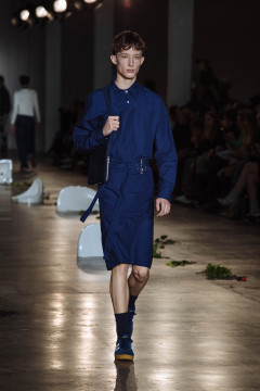 Community and belonging are at the core of the new collection by Per Gotesson, as they are of his work and life. Denim is Per’s signature material, cut into a trench with unassuming shape at the shoulders and voluminous elegance in the body. There’s also a strict-line double-breasted long denim coat that lined with fleece, and a short black jackete with rough-cut seems at the sleeve head. Workwear is used to subvert masculinity, seen through blood-red crushed velvet aprons and a long t-shirt dress that’s ruched at the chest bone.