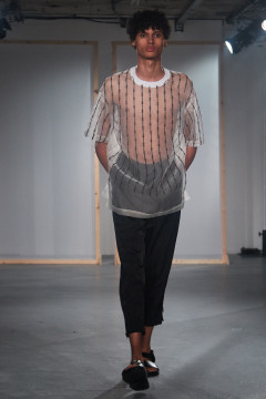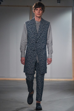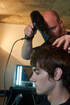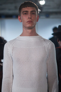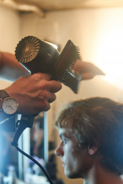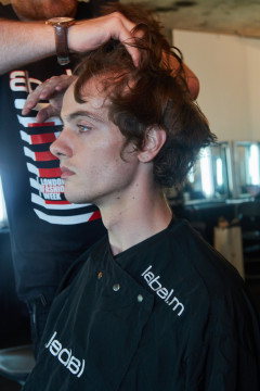 The hair reflects the collection motif using the late 60s and 70s as inspiration. A lot of movement, easy and not too neat, think a young Mick Jagger.