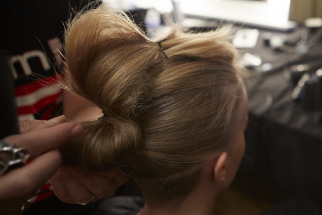 ![]()  Step 6Use a small amount of label.m Matt Paste on the remaining hair left in front of the face to create texture. Slightly pull hair from the looped buns for desired shape and finish with label.m Hairspray