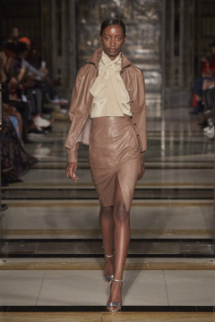 Continuing her signature use of bias cut layering of organic fluid fabrics juxtaposed with chic, clean fitted leather shapes and biker jackets. Masculine meets feminine this season with super fine tailored wool suiting worn with soft silk blouses