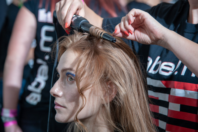 Once dried, add definition with label.m label.m Pro Advanced Tong 38mm. Don’t worry about creating perfect curls, the hair is meant to be irregular
