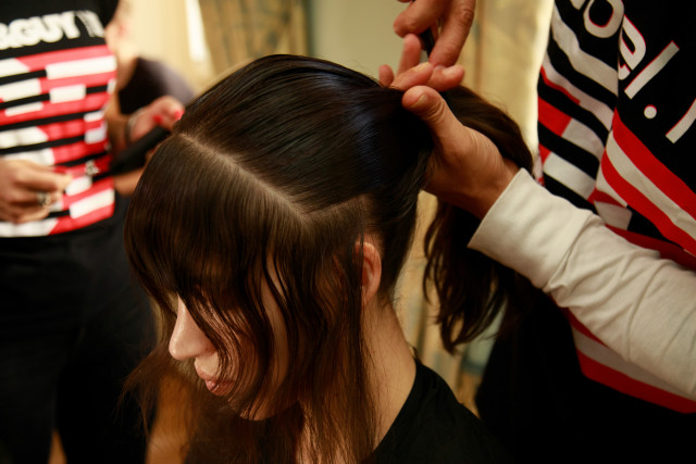 Separate front section of hair from ear to ear following the front hairline around and spray with label.m Hairspray