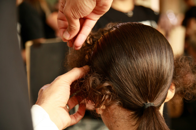 Place a hair net over the ponytail securing at the base. Twist into a knot and pin to the scalp. Finish off with label.m Hairspray