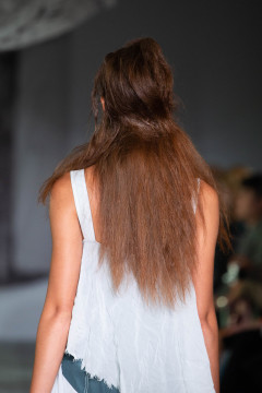 Fragility is continued in the hair by International Artistic Director Cos Sakkas and the TONI&GUY Session Team by looking into human strength, with a softness on top and solidity underneath. Inspiration is also driven from architecture and dilapidated buildings, with the bottom section reflecting the solid structure of the house and the loose hair on top represents the crumbling walls.