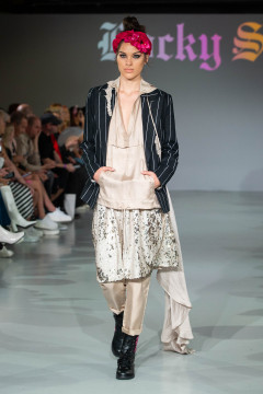 Daniele de Angelis, International Artistic Director and TONI&GUY Session Team created hair which followed the theme of rural farmers in India, with messy top knot buns accessorised with brightly coloured fuchsia pink turban-style head bands (paying homage to how farmers’ would keep cool in the sun) and accentuated by coordinating pink flowers placed to the side at the front.