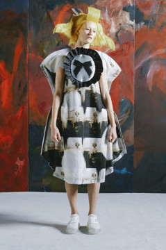 “The Girl Who Collected Memories” is a story of an imaginary character Rei. Amidst a Global Pandemic, as many of us, Rei feels insecure and out of control, like a leaf taken by the wild stream. To confront this feeling, she collects family photos of the people she never met and wears them as her clothes. Bringing her the feeling of belonging to the extended Global Family, these photos become her “armour”, protecting and empowering her. IA LONDON’S SS 2021 emerges from the context of a Global Pandemic. Proposing her point of view, designer Ira Iceberg symbolically uses light backgrounds, to oppose the darks, and silver-coated textiles as a base for the photographic prints, to emphasise their symbolic “armour” meaning. Iceberg also continues exploring the relationship between the body, form and image.